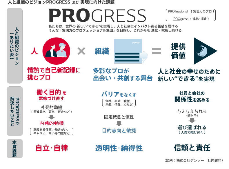 天野:私たちデンソーは人と組織のビジョン「PROGRESS」を掲げ、人事改革に取り組んできました(図表1)。社員には「情熱で自己新記録に挑むプロ」になってもらいたいという想いを込め、そのための本質課題を「自立・自律」と定めました。そして、キャリア研修やキャリアデザイン面談などを強化し、社員の「キャリア自律」を推進してきました。
