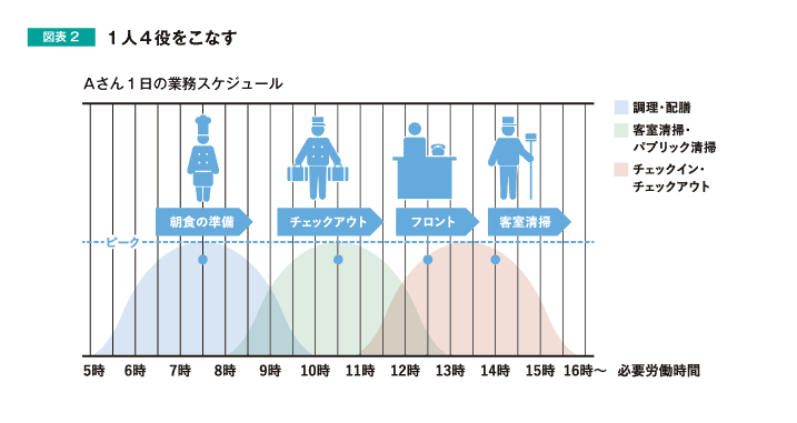 この数値が上昇すると、どんなメリットがあるのか。「お客様に接する時間が増えると、情報も増えますので、滞在中のイベントなど、お客様を喜ばせる魅力的な提案を考えつく確率が高まります。また、社員の生産性も高まります。例えば、フロント業務のスキルしかもっていない社員は、チェックインとチェックアウトのときのみ多忙で、それ以外の時間が暇になってしまいますが、4つのスキルを備えていれば、連続して仕事ができるのです」