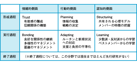Illgenら(2005)は、組織におけるチームの研究をレビューするにあたり、チームの形成過程、実行過程、終了過程の3つに分け、それぞれの過程の下にチームメンバーの情緒的側面、行動的側面、認知的側面についてどのようなことが起こるかをまとめています(図表02)。欧米における先行研究では医療チームや軍隊のチームといった異質役割集団を対象としたものが多いため、このプロセスモデルは異質役割集団について考えるときに適したものになっています。