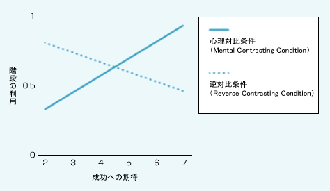 図表04は彼らが行った実験の結果を示しています。まず実験参加者は、日常的な運動が健康にもたらす効果について短いレクチャーを受けた後、自分が普段の生活のなかで運動を行い、うまく健康を維持できると思う程度を予測します。その後、実験参加者は日常的に身体を動かすことで将来得られるであろう望ましい結果を想像します(心理対比条件;Mental Contrasting Condition)。続いて実験者から、エレベーターなど生活が便利になったことが体を動かす機会を減らしているとの阻害要因に関する情報を提供されます。一方、別の実験参加者は、先に阻害要因に関する情報提供があった後に将来の望ましい姿を想像します(逆対比条件;Reverse Contrasting Condition)。実験が終了したと告げられた後、外に出てエレベーターを使用するか否かを観測し、これを結果変数とします。図表04はその結果を示したものですが、心理対比条件では、運動による健康増進に成功するだろうと思う人ほど、階段を使用したことが示されています。ところが、逆対比条件では、健康増進に自信のある人ほど階段を使わない傾向がありました。心理的対比条件では、まず将来のゴールがあって、そこに向けて具体的に克服すべき障害を考えるため、2つの関連性は強まると考えられます。エレベーターという刺激に直面したときに、自分の望ましい将来を阻害するものとの認識があるため、使用は避けたということでしょう。逆に逆対比条件では、この関連性が弱く、なんとなく自分は大丈夫だと思っているからこそ、安易にエレベーターを使用したのかもしれません。