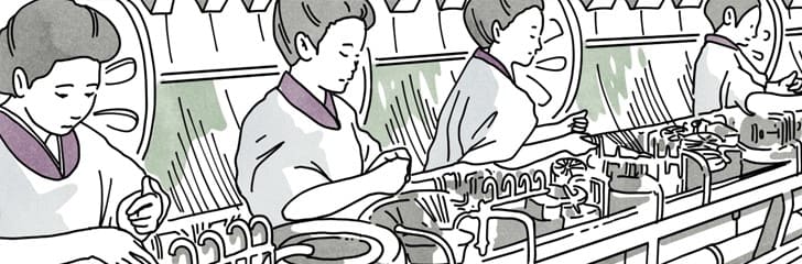 富岡製糸場とは違い、他の工場での労働は苛酷でした。朝早くから夜遅くまで、休む間もなく働いていたという記述が多く残っています※7。女工の出身も、良家の子女から農村や都市の貧しい平民層へ移行していきました。