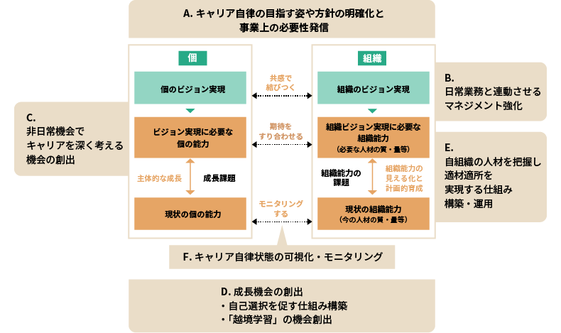 「E. 自組織の人材を把握し適材適所を実現する仕組み構築・運用」、「F. キャリア自律状態の可視化・モニタリング」については、次回以降のコラムで触れさせていただきます。