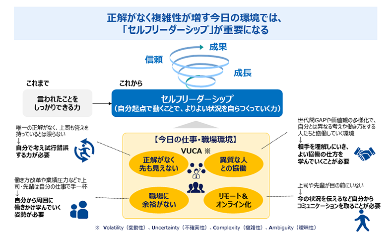 このようなビジネス環境で新人・若手社員に身につけてほしい力が、どのような環境においても自分起点で動くことで、よりよい状況をつくり出す力「セルフリーダーシップ」です。つまり、自分にとって理想的な環境でない場合や周囲の力を借りづらい場合でも、自律的に行動を起こし、状況を変えていく力を養うことが、昨今の仕事環境を考えたときに新人・若手社員にとって必要になるのです。