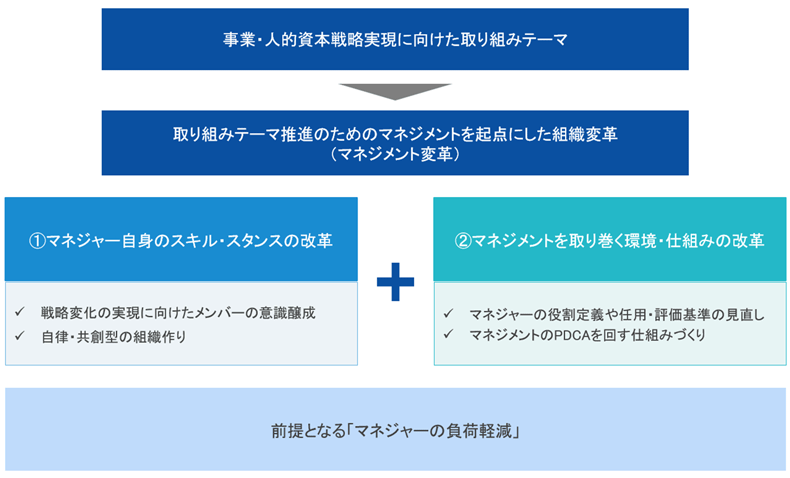 この状況を打開するには、経営と現場の結節点である管理職を基点とした組織変革、すなわち「マネジメント変革」が必要です。マネジメント変革とは、マネジャー自身のスキル・スタンスの改革と、マネジメントを取り巻く環境・仕組みの改革の2つからなります。ただし、その前提として、現状の管理職の負荷を軽減することが不可欠です。