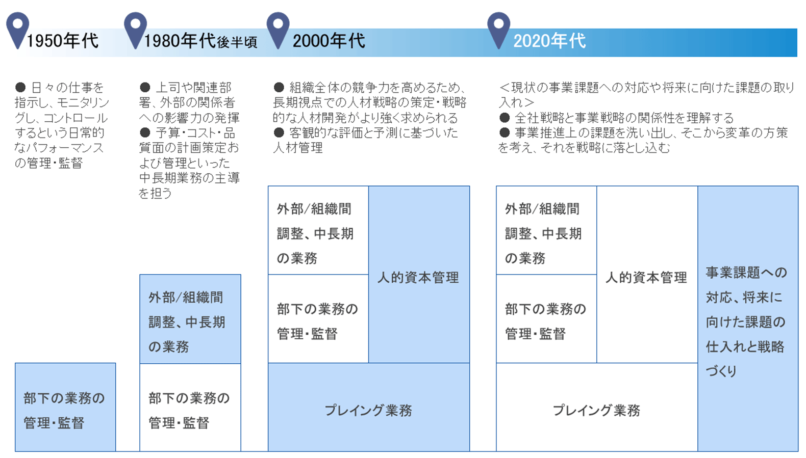 管理職に求められる役割は、年々拡大しています。かつては業績管理と部下育成が中心でしたが、現在ではそれに加えて、組織開発的な役割──風土構築、チームビルディング、多様な個をエンパワーメントすること──が求められています。さらに、プレイングマネジャーとして自ら業務を担うことが常態化しており、管理職の負荷は増大の一途をたどっています。加えて、管理職自身のコンプライアンス順守やハラスメント防止への意識が厳しく問われる時代となり、心理的な負担も増しています。