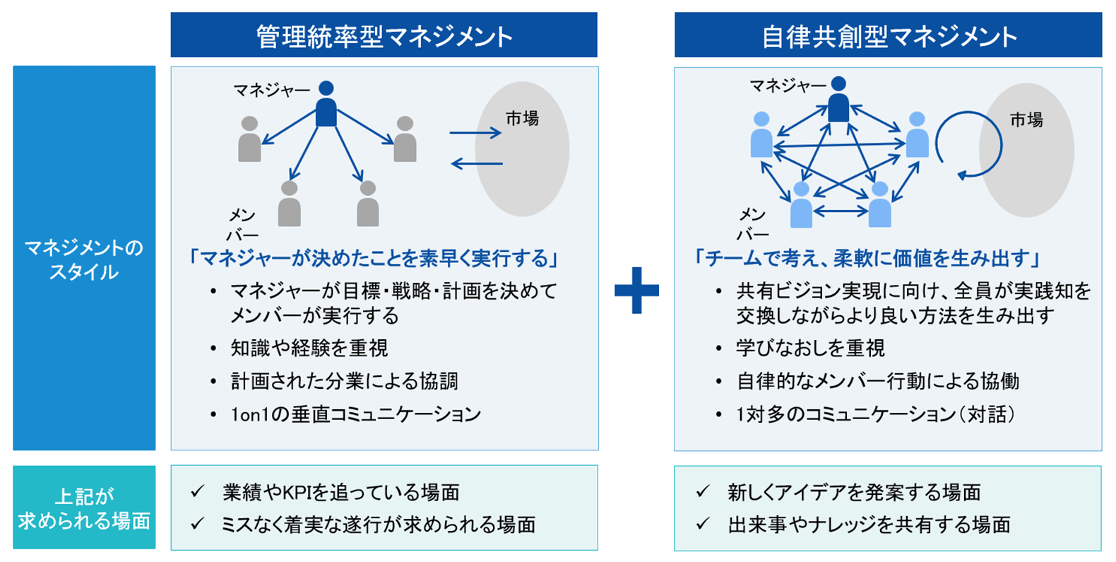 一方で、不確実性の高い環境下では自律共創型マネジメントが力を発揮します。メンバー一人ひとりが自律的に考え、行動し、互いに協力しながら成果を生み出す。管理職の役割は、対話を通じてメンバーの自律を促し、共に創造する支援者となります。