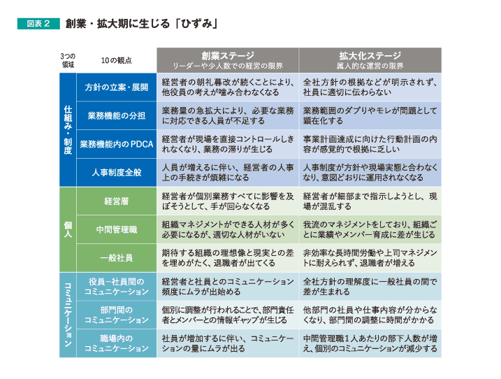 それでは、創業・拡大期に生じる「ひずみ」とは、具体的にどのような事柄なのか。先行研究(ダフト、グレイナーなど)や弊社調査をもとに主な「ひずみ」を3つの領域・10の観点で整理した(図表2)。調査結果の一部を図表3にご紹介する。