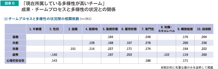 ・チームが目的が達成されたら解散する期間限定のものである場合には、「国籍」「勤務地」「専門性」「知識・スキルレベル」「職務経歴」「価値観」が、そうでない場合に比べ、多様であることが分かりました。
