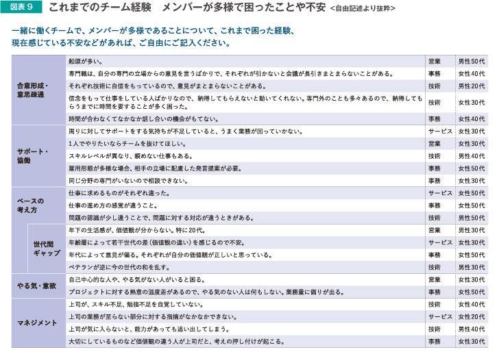 ・業務推進、人間関係構築上のベースの考え方に関する記述も多く見られ、判断基準が異なったり、直面する問題の捉え方、対処の仕方が異なったりすることによる大変さが感じられました。中でも、世代間ギャップについての具体的な記述が散見されました。