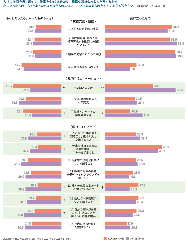 ●「同期との交流」「職場メンバーとの業務外の交流」について、19入社は役立っている一方で20入社は不足を感じている(図表3)・「業務支援・相談」では、年次間で有意差はなく、「1.上司、2.育成担当者、3.職場の先輩たちからの面談や支援」については5割から6割近くが役に立ったと回答。・「社内コミュニケーション」の「5.同期との交流」「7.職場メンバーとの業務外の交流」は、19入社は役に立ったもの、20入社は不足の選択率が高い。「6.社内の他の職場の人との交流」は両年次とも相対的に不足が多く、約3割が選択していた。・「学び・インプット」では、役に立ったものとして、20入社の方が「12.社内の意思決定ルートについて知ること」が多い。また、すべての項目で19入社の方が不足の割合が高いのが特徴的だ。