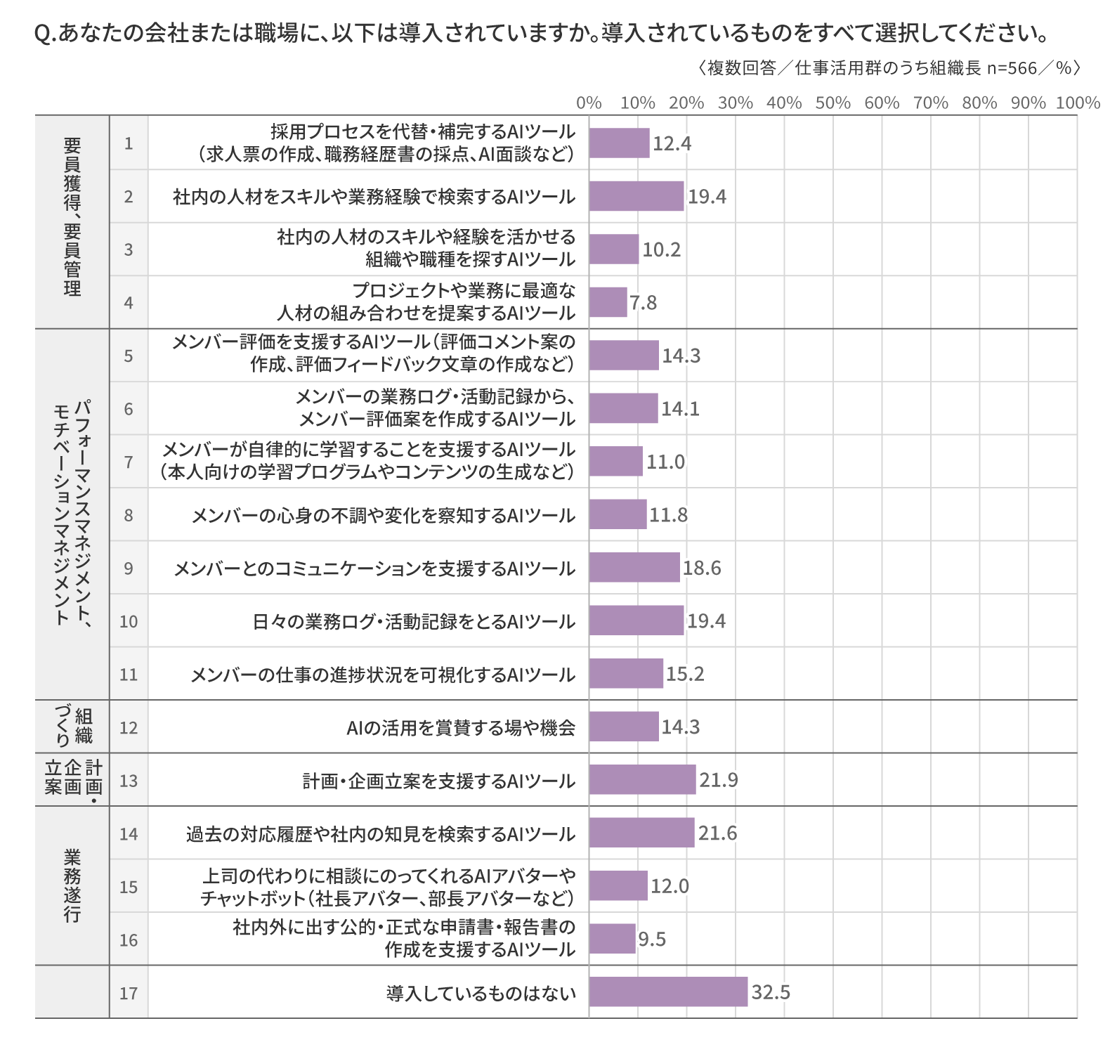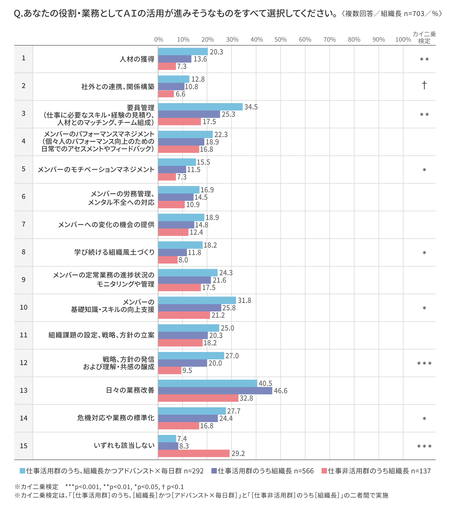 ⇒これらの結果から、マネジャー業務におけるAI活用は、まずは日常業務の効率化や要員配置といった比較的構造化された領域から進展し、徐々に人材マネジメントの高度化へと広がっていく可能性が示唆される。
