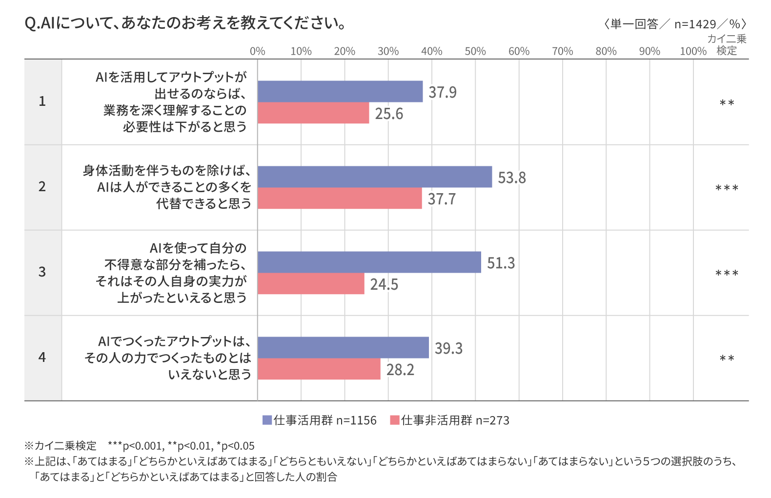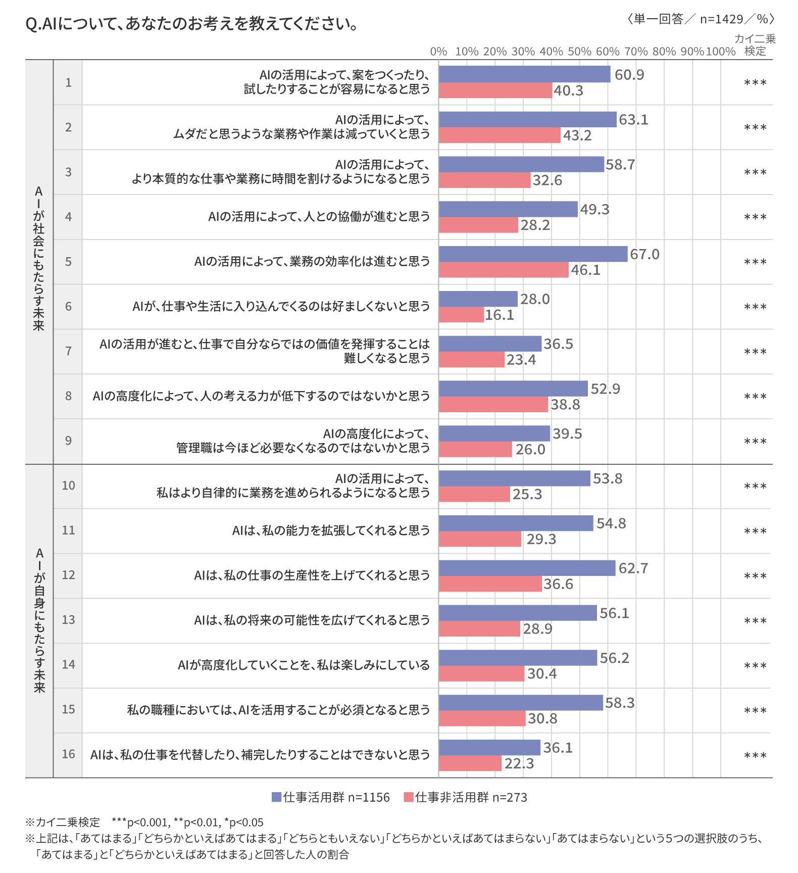 ⇒これらの結果から、AI活用者はAIのもたらす効率化や可能性拡張に期待を寄せている一方で、思考力の低下や個人の価値の希薄化といったリスクも認識しており、期待と危機感が同時に存在していることが示唆される。
