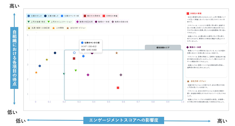 このようなお声を受け、今回のリニューアルでは回答者の負担を高めないよう、インサイズ1回の実施で「個人」だけでなく「組織」の状態も同時に可視化し、改善に繋げられるよう進化します。個人の多様性と組織の複雑性が高まる中、「個人」と「組織」の両面から課題を可視化し、現場が自ら動き出す“仕組み”がなければ、真の組織変革は実現できません。「インサイズ」は、その両面を可視化するだけでなく、スコアの先にある“原因”と“打ち手”まで明らかにし、組織変革を実現します。サーベイの設問は自由度が高く追加設定も可能なため、各社の独自指標を結果指標に反映することも可能です。 従来の「インサイズ」の機能・価値はそのままに、組織エンゲージメントの測定機能を新たに搭載することで、人事施策やマネジメント改善の場面で、さらに幅広く活用いただけるようになりました。