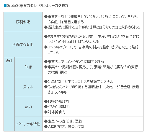 このモデルを参考に、私たちは、典型的な日本企業のマネジメント階層をGrade1(取締役クラス)~Grade5(係長クラス)に分け、それぞれの階層に求められる役割機能と、その役割機能を果たすためにはどのような「知識」「スキル」「能力」「パーソナル特性」が必要とされるのか、という側面から仮説を立てました。また、その直前の階層から昇格してきた際(転換点)に、どのような大きな変化に直面するのか――つまり、ステージ転換にともなって特に求められる「知識」「スキル」「能力」「パーソナル特性」についても仮説を構築しました。以下にその一部をご紹介いたします。