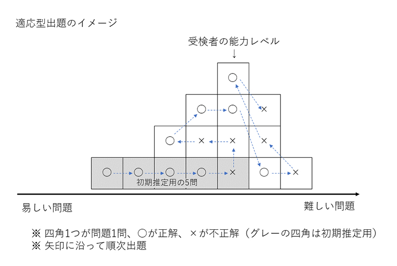 ①初期推定:さまざまな難易度の問題を数問解いてもらい、その正解状況によって能力レベルをおおまかに推定します②出題:受検者の能力レベルに合った難易度の問題を項目プールからピックアップして出題します③推定:出題された問題への回答を採点し、能力レベルを再推定し、②に戻ります④検査終了:③の推定結果が信頼できるものと判定したら検査を終了します