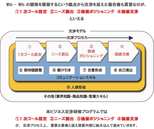 「交渉」という抽象度の高い概念を分かりやすく表現するために、「交渉モデル」を設定し、「交渉」という行為をプロセスでとらえることで、交渉の全体像を体系的に把握することができるようになります。
